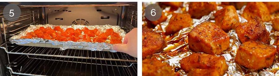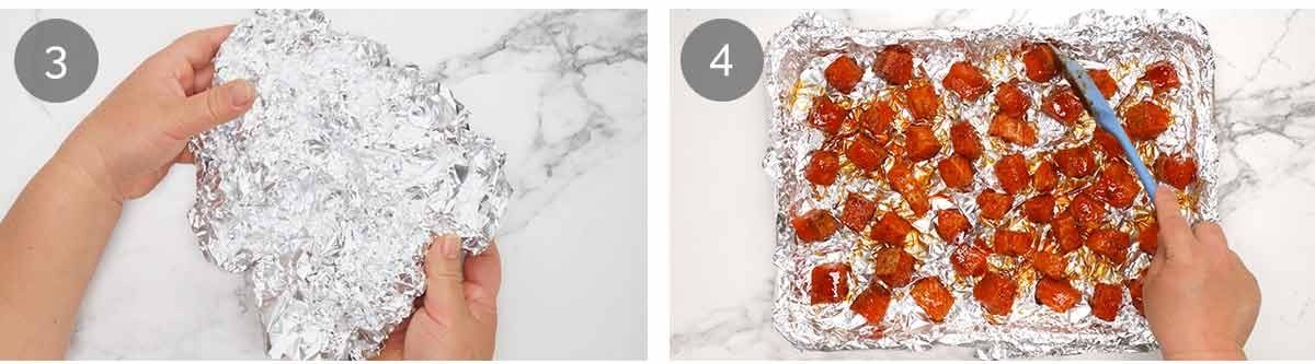 Wrinkle foil up by lightly scrunching it with your hands then unfold it without flattening the wrinkles and cover the tray. We want lots of little crinkly wrinkly little ridges, bumps and lumps all over the foil that will act as microscopic little “prongs” that keep the salmon elevated off the tray – this is what stops the underside from getting soggy which makes the Cajun spice sweat off. It also prevents the salmon from sticking to the tray. Nifty little Japanese fish cooking technique I picked up from my mother!