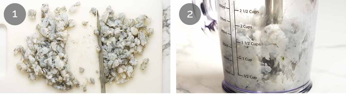 - Thaw – If using frozen prawns, thaw thoroughly and discard excess water (you lose ~20% in weight in water), then chop into 8mm / 1/3" pieces.