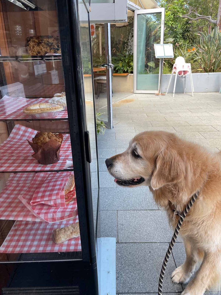 Eyeing end of day remnants in a glass cabinet like it’s a big juicy steak.