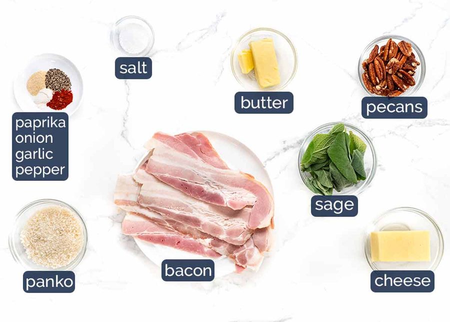 - Stuffing (*see below for prepping components*)- Mash the potatoes with a fork. Then add the browned butter, 1/2 tsp salt, pepper, garlic, onion powder and paprika. The add half of each the pecans, bacon and cheese (rest reserved for toppings). Stir until combined.