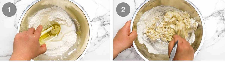 - Mix the flour, sesame and salt in a bowl using a rubber spatula or wooden spoon. Make a well in the centre then add the water and oil. Using the handle of the spatula to mix until the flour is incorporated.