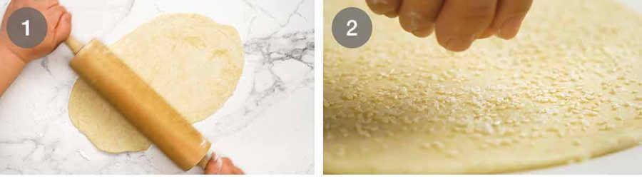 - Sprinkle – Place a sheet of baking paper (parchment) on a cutting board. Transfer the rolled out dough onto the paper. Sprinkle with half the sesame and half the salt flakes. Roll out even thinner on the paper to 2mm / 1/12" (thinner = crispier).