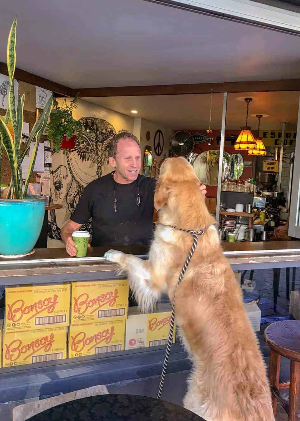 And Dozer spends a lot of time smooching with the other patrons, getting scraps and LOTS of cuddles. And occasionally he orders a puppa-cino…. (jokes. Never!)