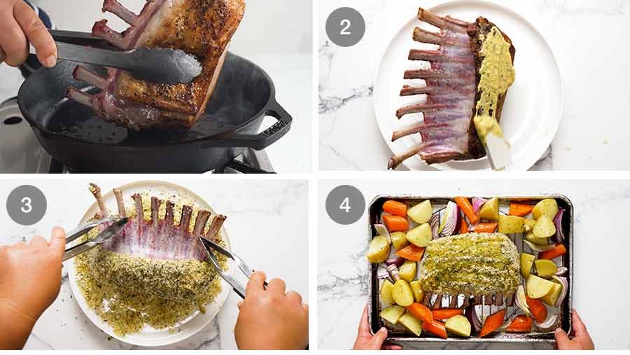 - Crumbing the lamb: Spread the underside of the rack with mustard mix. Press into breadcrumb mixture, then spread mustard mix over the other side as well as each end. Then press those sides into the breadcrumb mixture.
