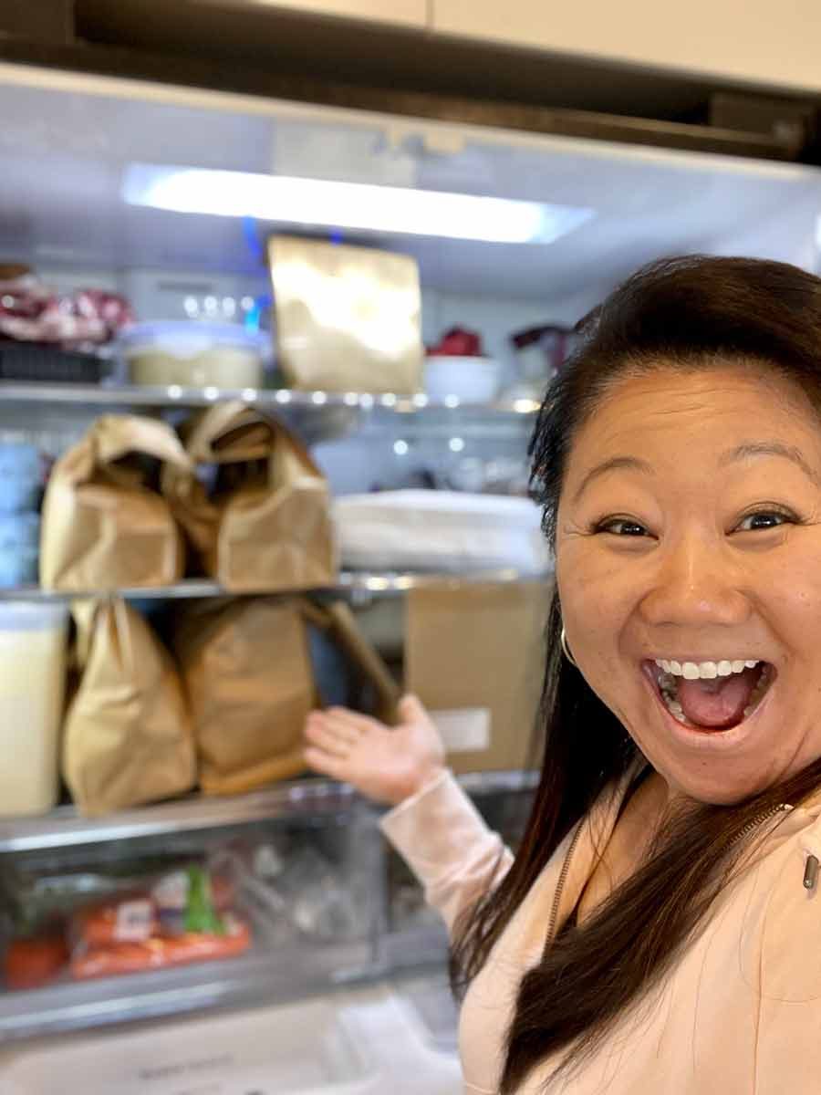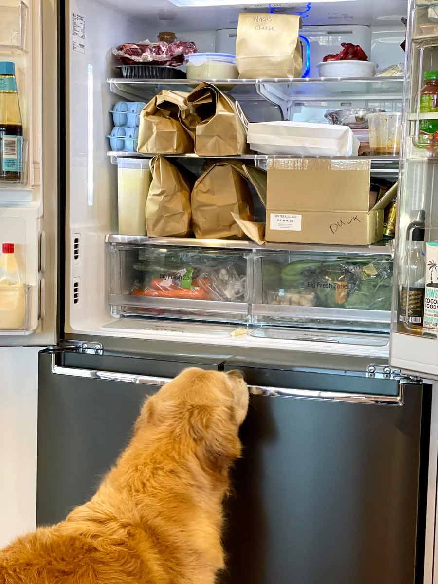 The moment when Dozer discovered the fridge was full of French cheese… (for care packages for my team going out shortly!)