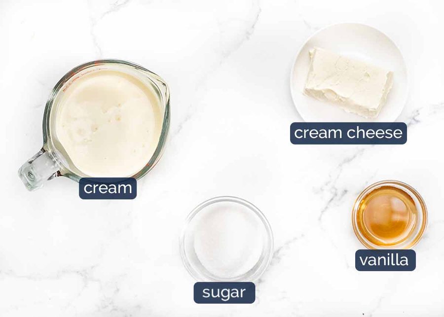 - Whipped cream – Put the cream cheese, vanilla and sugar in a bowl. Beat with an electric beater on high for 1 minute until soft and creamy. Add cream and peat until firm peaks form. (If using stand mixer, use whisk attachment).