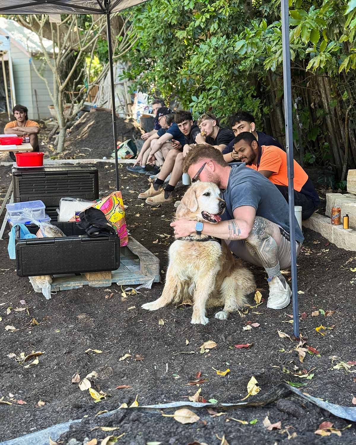 Dozer looks like he is eating up all the pets and love from those tough tradies.