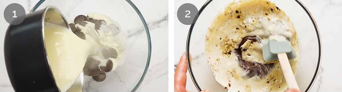 - Melt chocolate – Place chocolate in a microwave-proof bowl. Heat cream until hot, just before boiling – do not let it boil, it's too hot. Pour over chocolate, shake bowl to submerge all the chocolate.