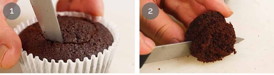 Trim excess off the cake you scooped out to leave a ~1cm/0.4″ thick lid. Make sure you keep the lids and cupcakes together so they fit properly – unless you are a baking genius who cuts lids exactly the same size for every single cupcake (not me, that’s for sure!!)