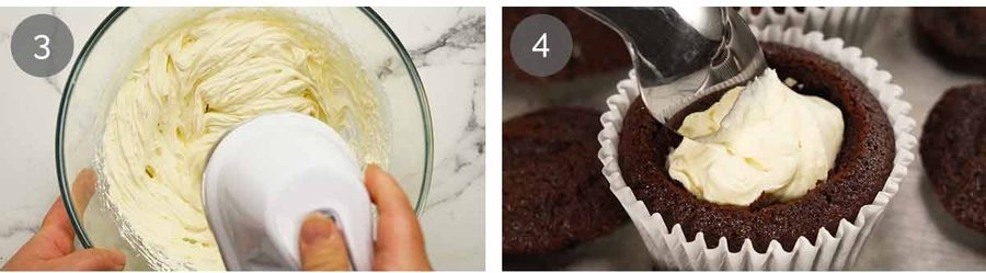 To be honest, because the cream is inside the cupcake rather than piped on top, it doesn’t really matter as much if the cream is a little less fluffy than freshly whipped. I didn’t mind this on day 3 even with plain whipped cream (I whipped to stiff peaks), but it is better when it’s been stabilised a bit because it stays fluffier. Also, the slight tang from the cream cheese makes this extra good, I think.